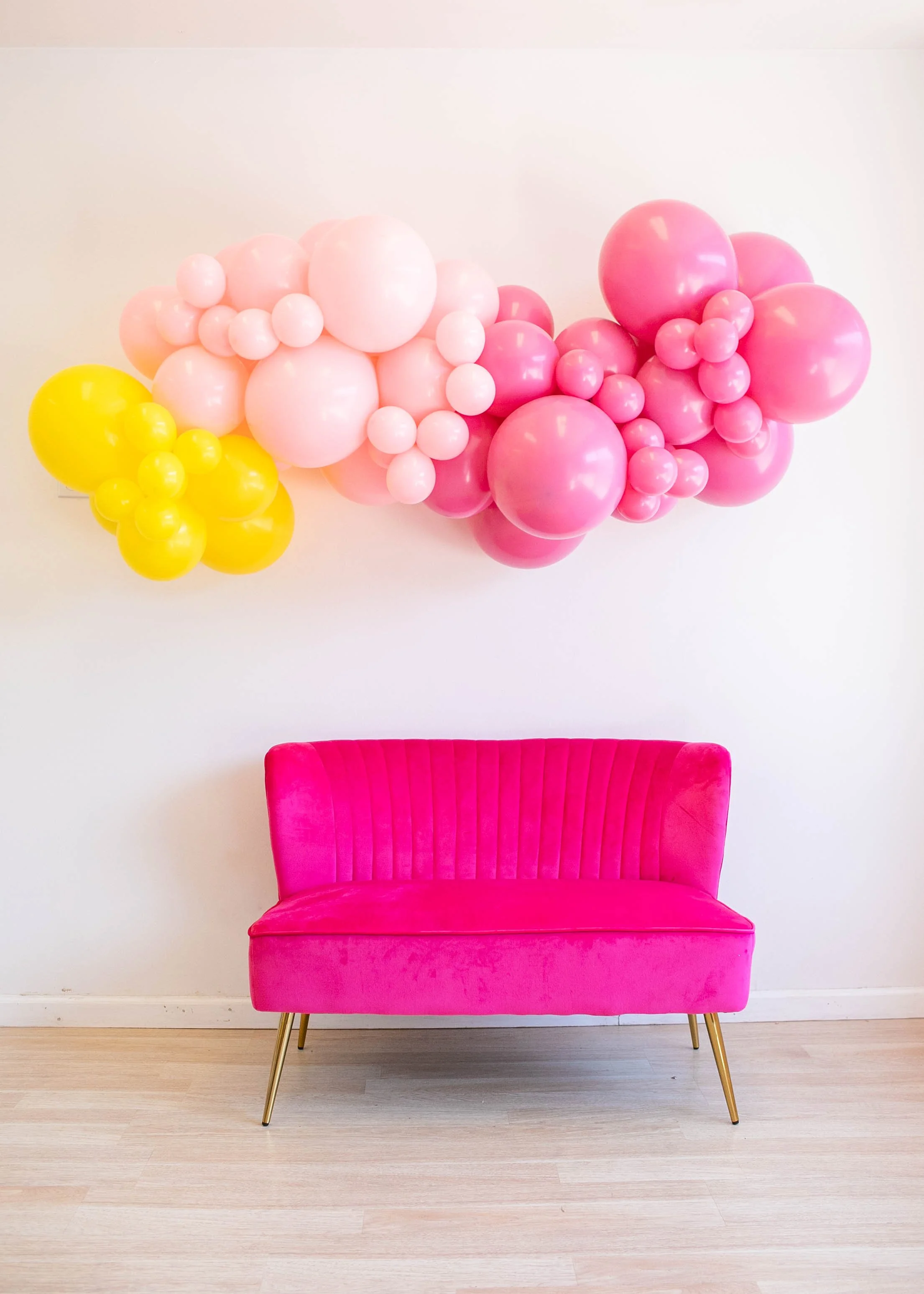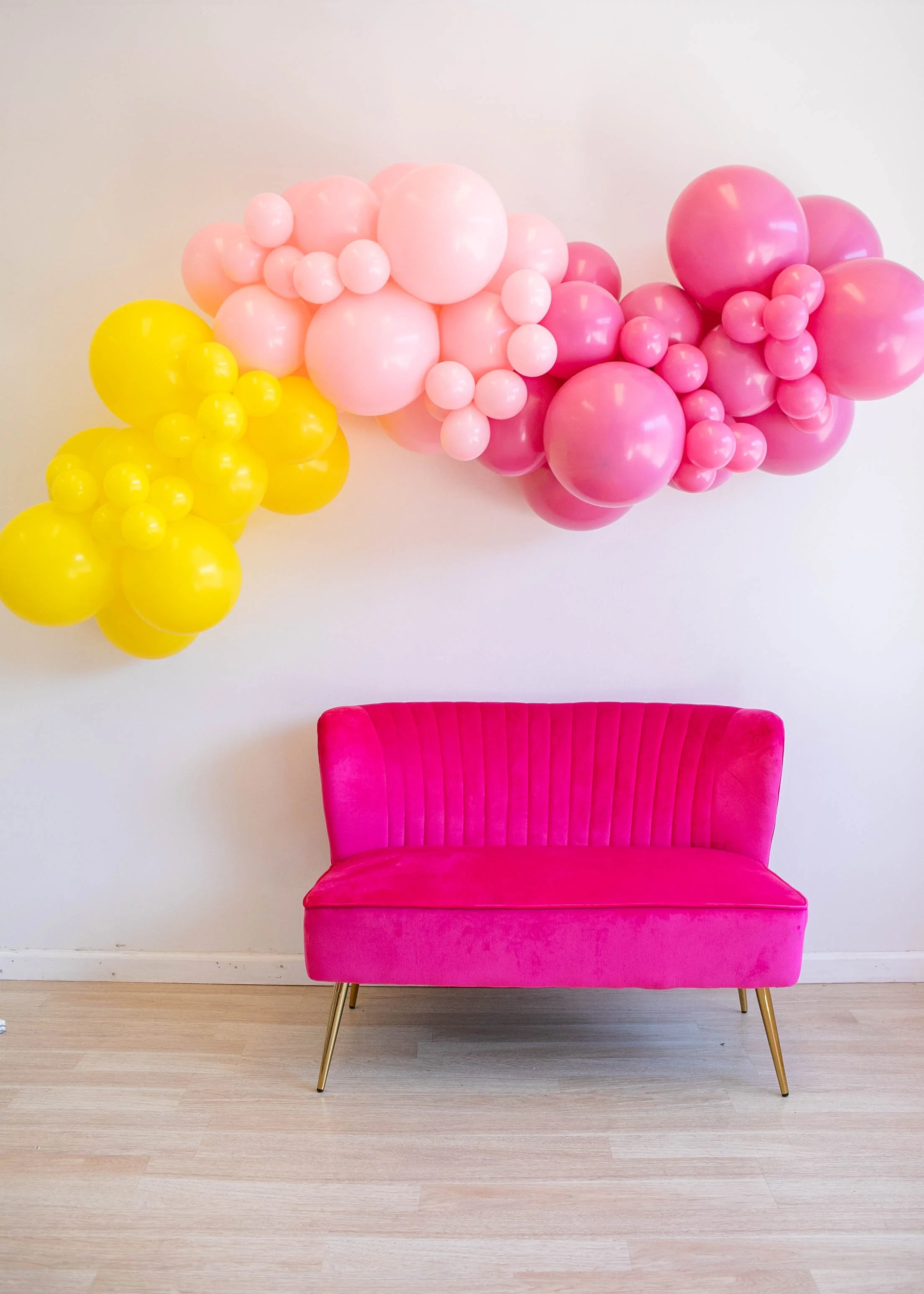 Looking for a smaller balloon garland to give your event some pizzazz? We offer balloon garland in 5, 6, or 8 ft. You will pick it up from our studio in Belmont. It will come with installation instructions, we have pictures and a video, and some installation supplies.