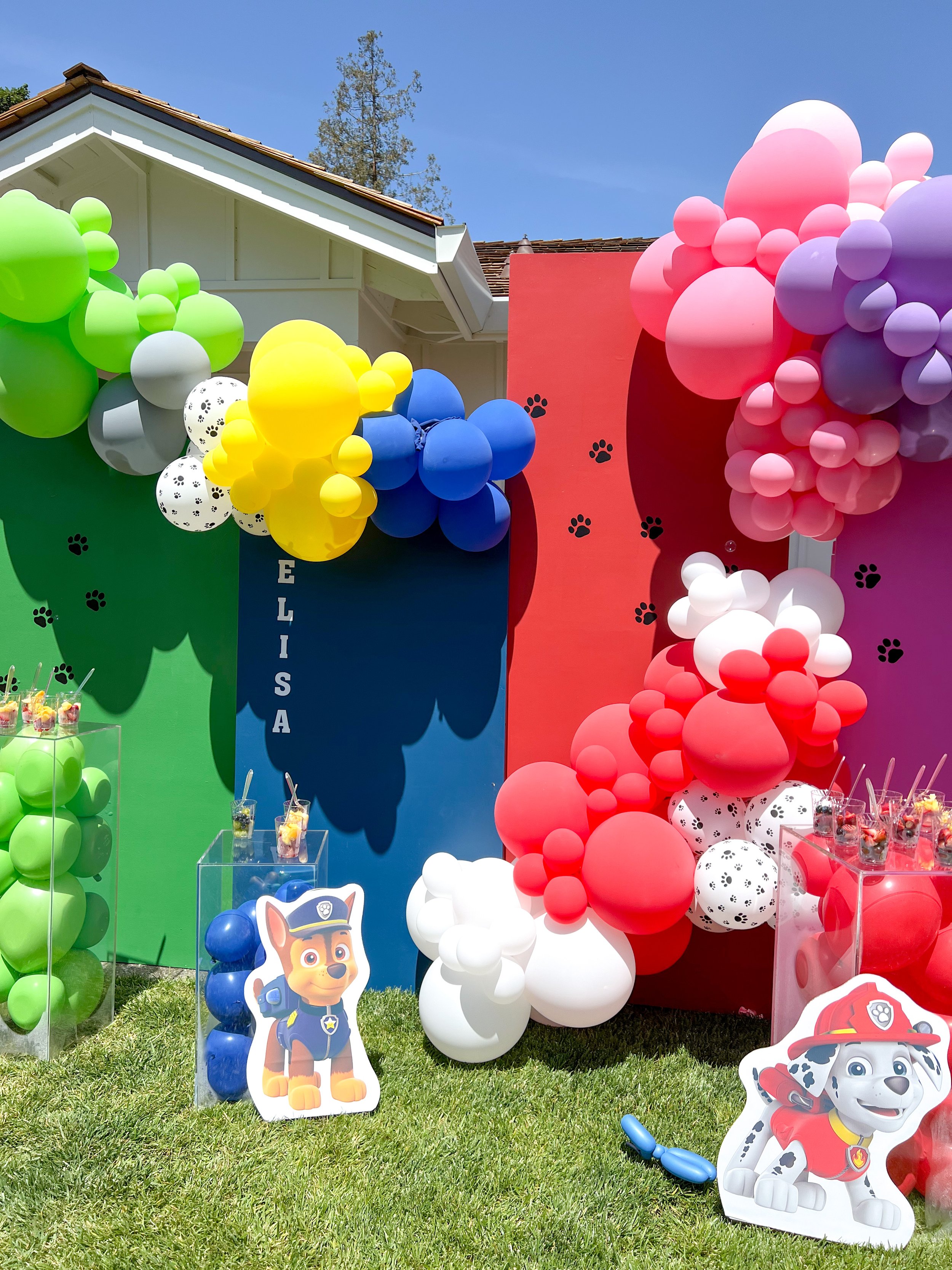 A backyard bursting with vibrant, fun colors that make your heart do a happy dance. I built an arrangement of plenty of bright colors that caught everyone's eye. Each section of the balloon displays were personalized to each one of the pups in the show.